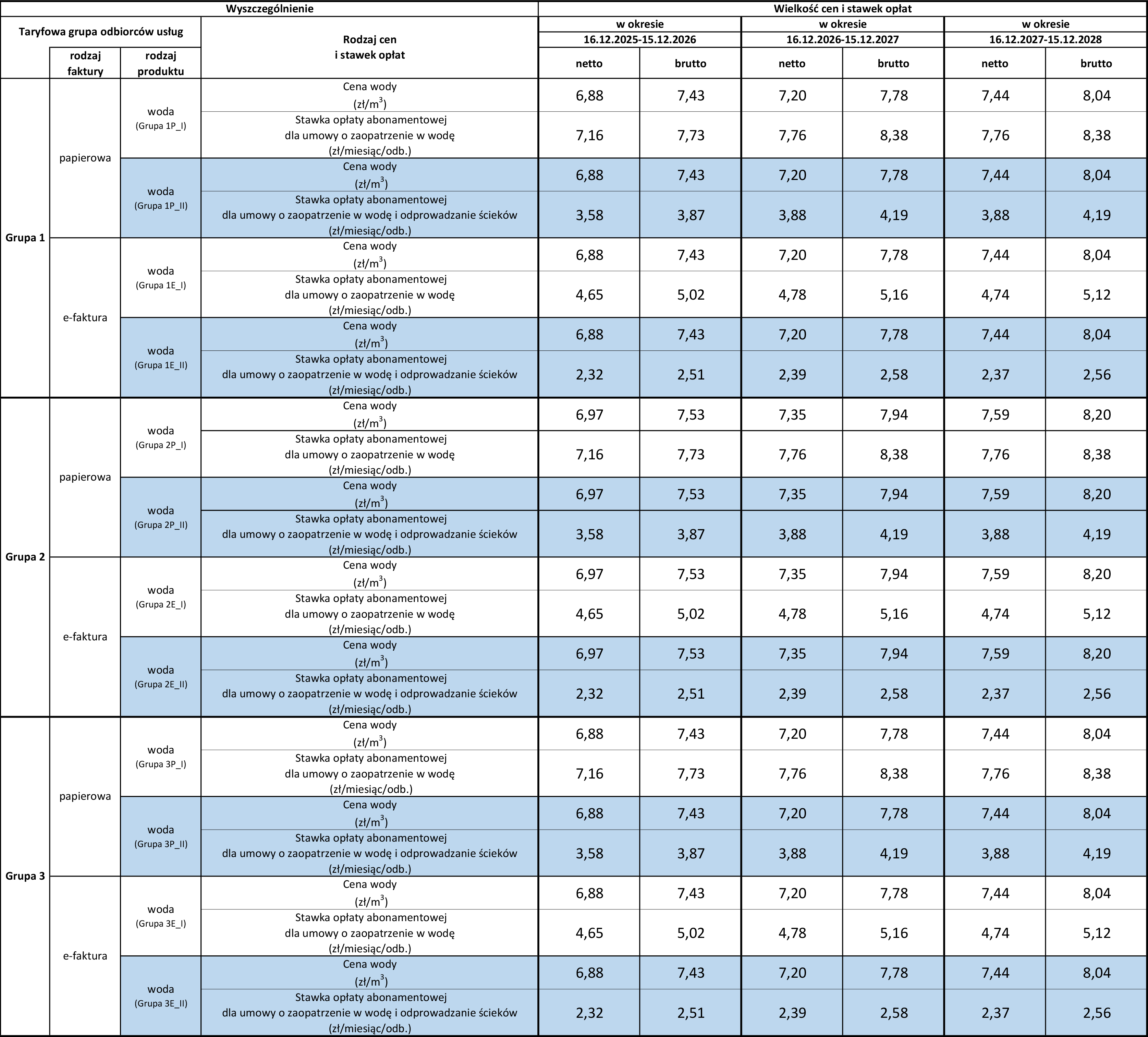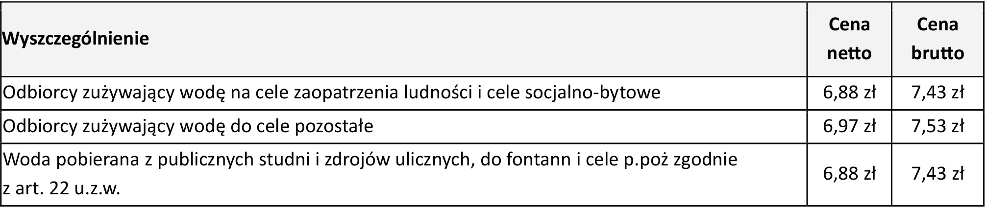 Ceny za 1 m3 dostarczonej wody w okresie od 16.12.2025 r. do 15.12.2026 r.: