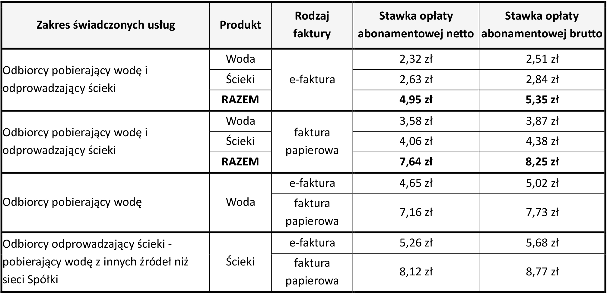 W wystawionej fakturze rozliczeniowej uwzględniona jest także stała opłata abonamentowa, która pokrywa koszty związane z obsługą i rozliczaniem odbiorców usług i wystawianiem oraz dystrybucją faktur. Jest ona zawsze w takiej samej wysokości, bez względu na ilość pobranej wody lub odprowadzonych ścieków.