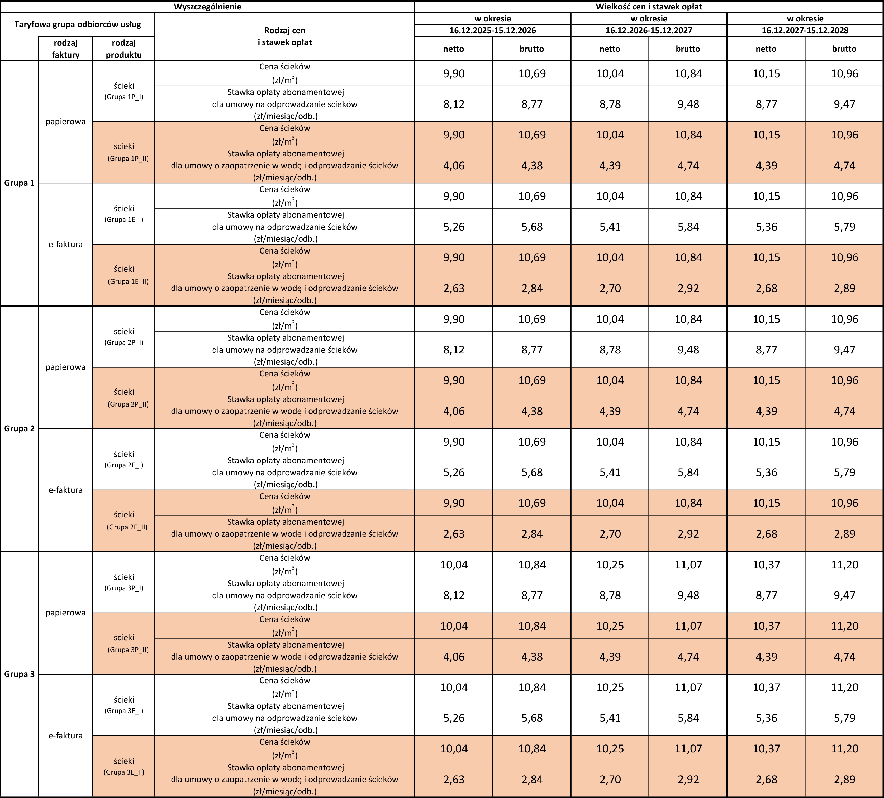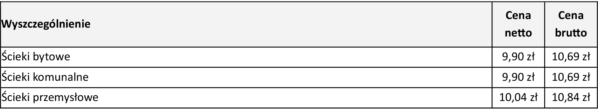 Ceny za 1 m3 odprowadzonych ścieków w okresie od 16.12.2025 r. do 15.12.2026 r.:
